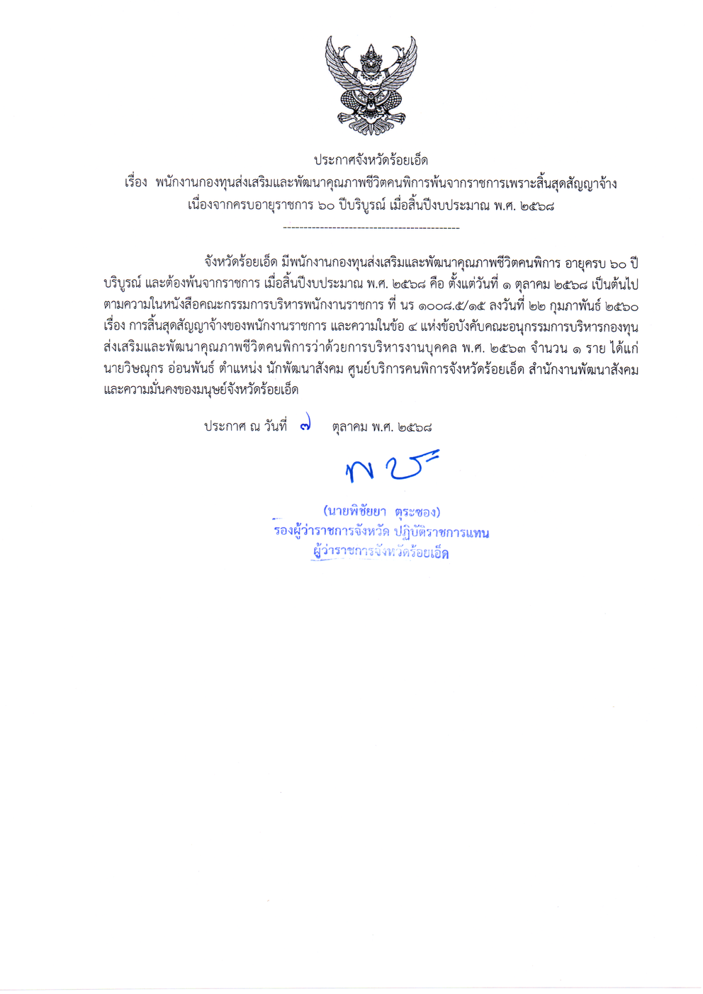 เรื่อง พนักงานกองทุนส่งเสริมและพัฒนาคุณภาพชีวิตคนพิการพ้นจากราชการเพราะสิ้นสุดสัญญาจ้าง เนื่องจากครบอายุราชการ 60 ปีบริบูรณ์ เมื่อสิ้นปี งบประมาณ พ.ศ. 2568